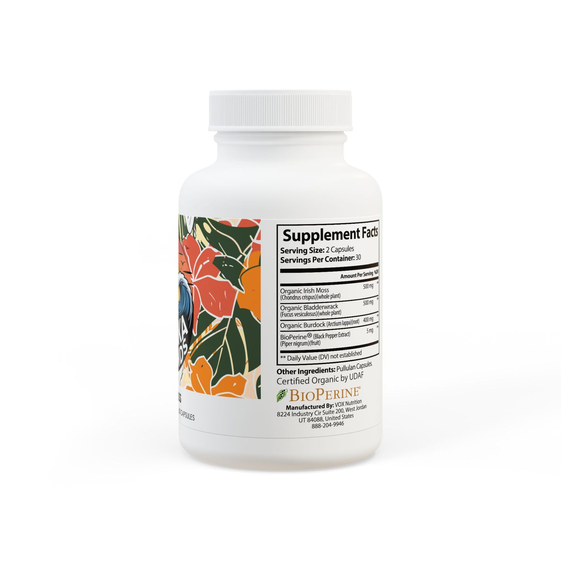Ingredients: Organic Irish Moss (Chondrus crispus)(whole plant), Organic Burdock (Arctium lappa)(root), Organic Bladderwrack (Fucus vesiculosus)(whole plant), BioPerine® (Black Pepper Extract), (Piper nigrum)(fruit). Other Ingredients: Pullulan Capsules.